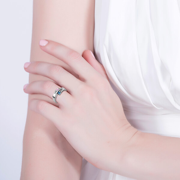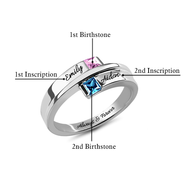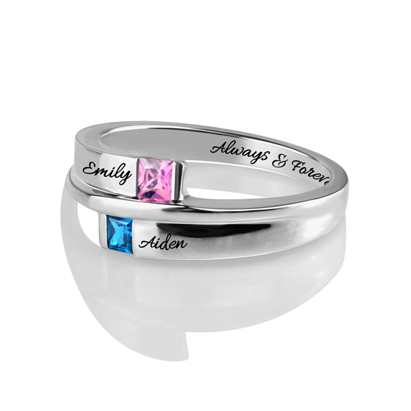 この二重の正方形の誕生石リングは、流行に敏感な女の子のためのものです。選択した2つの対応する名前(それぞれ最大10文字)を派手なスクリプトフォントで刻印して、リングをカスタマイズします。このリングで、あなたは特別です。