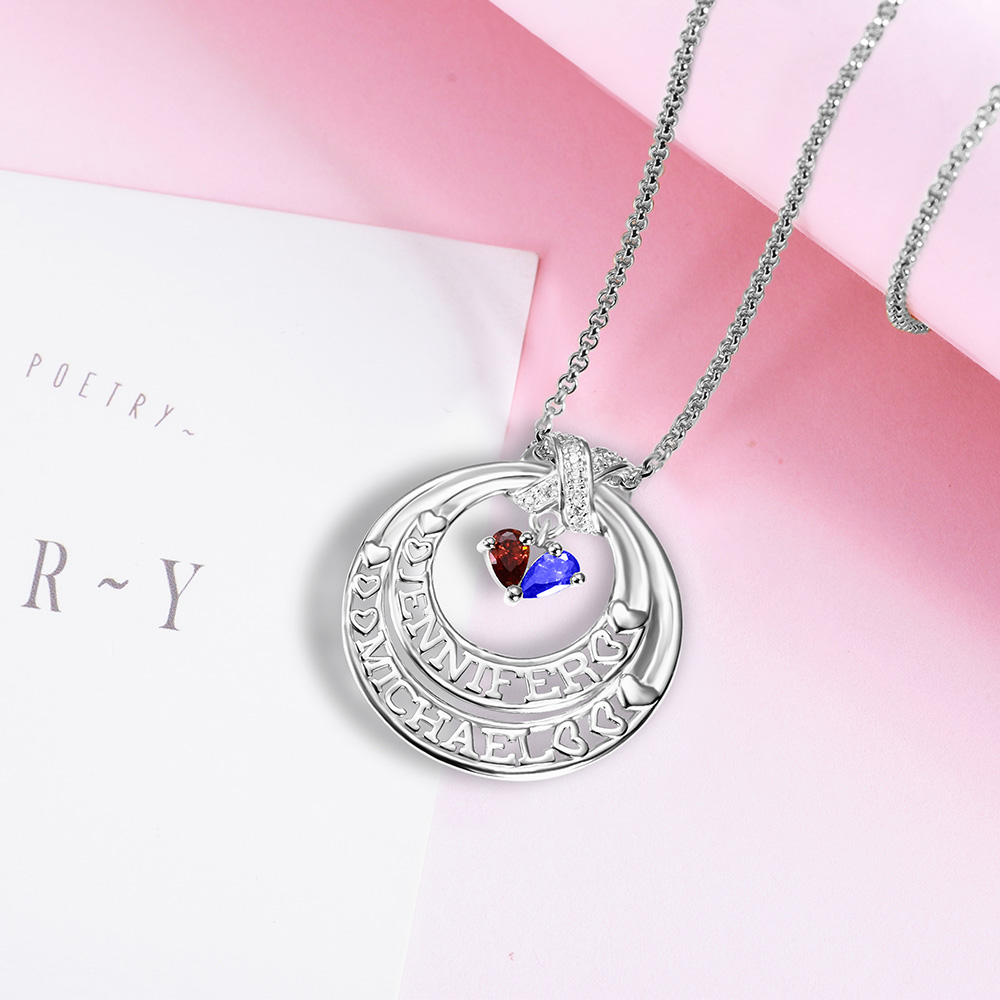互いに入れ子になったこのネックレスは、2つの名前の円が積み重なっていて、1つに恋をした気分を表現しています。誕生石が中央にあり、愛する心のように囲まれている間、きらめく結び目が円をつなぎます。このネックレスを名前と誕生石でパーソナライズして、心地よい暖かさを添えましょう。